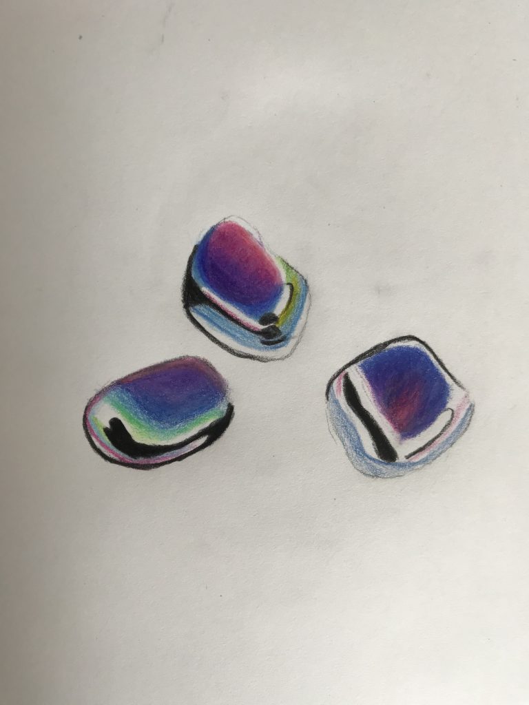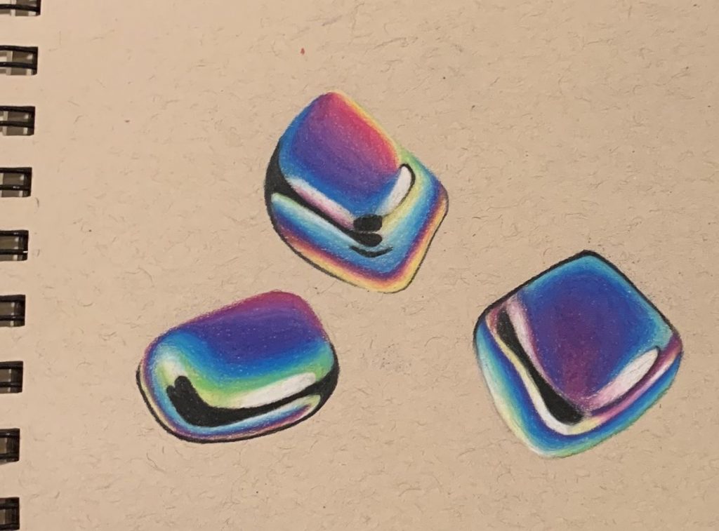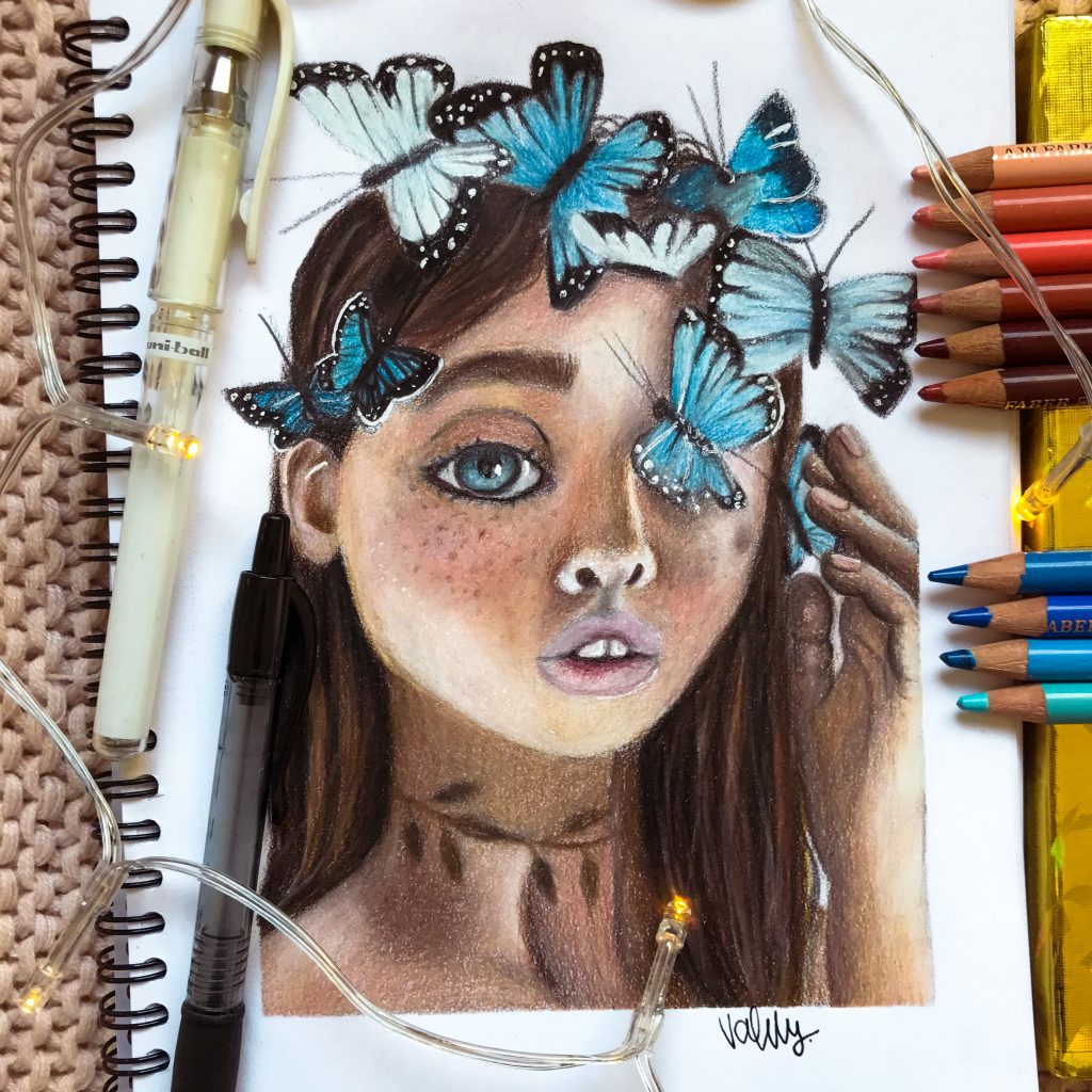Zum Schluss noch die Schmetterlinge; Die werden sehr detailliert mit Buntstift und weißen Gelstift gemacht. Der Ablauf ist meistens der Selbe; Am Rand der Flügel ist es schwarz, genauso wie in der Mitte.