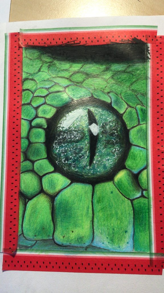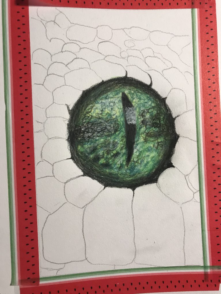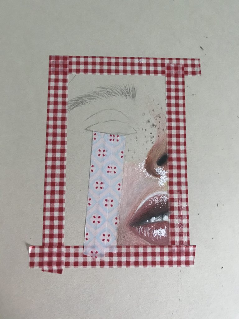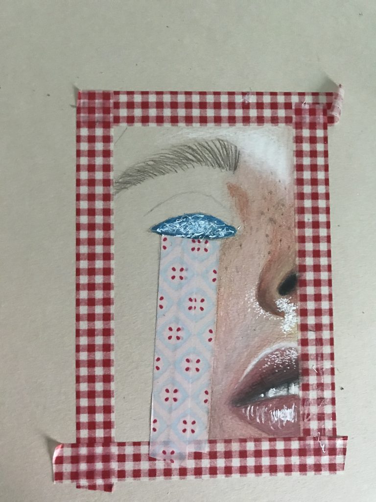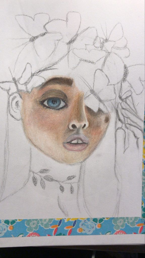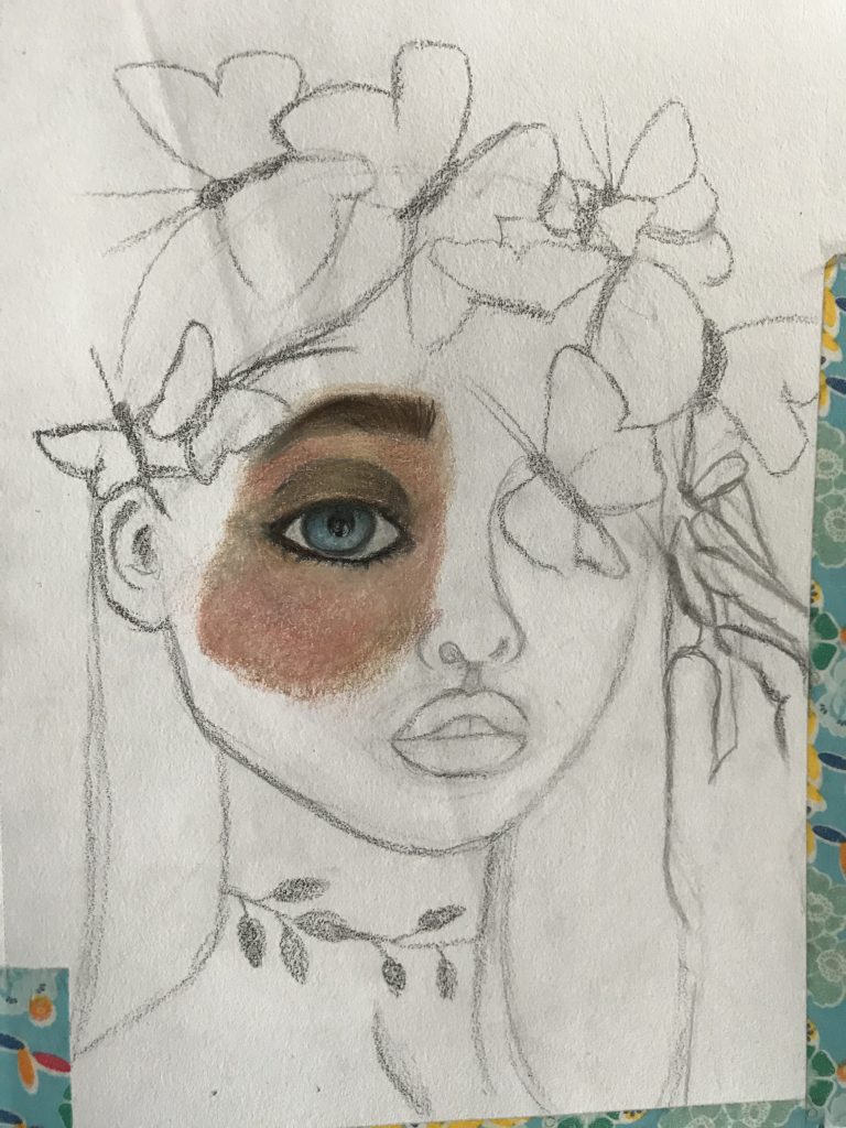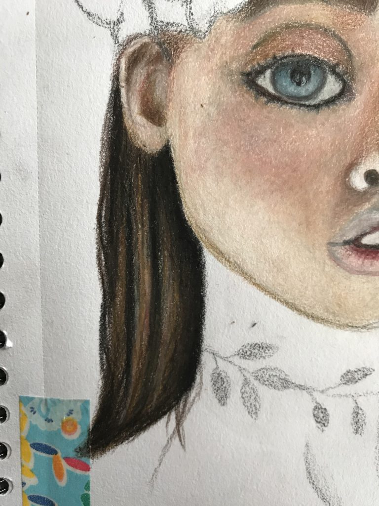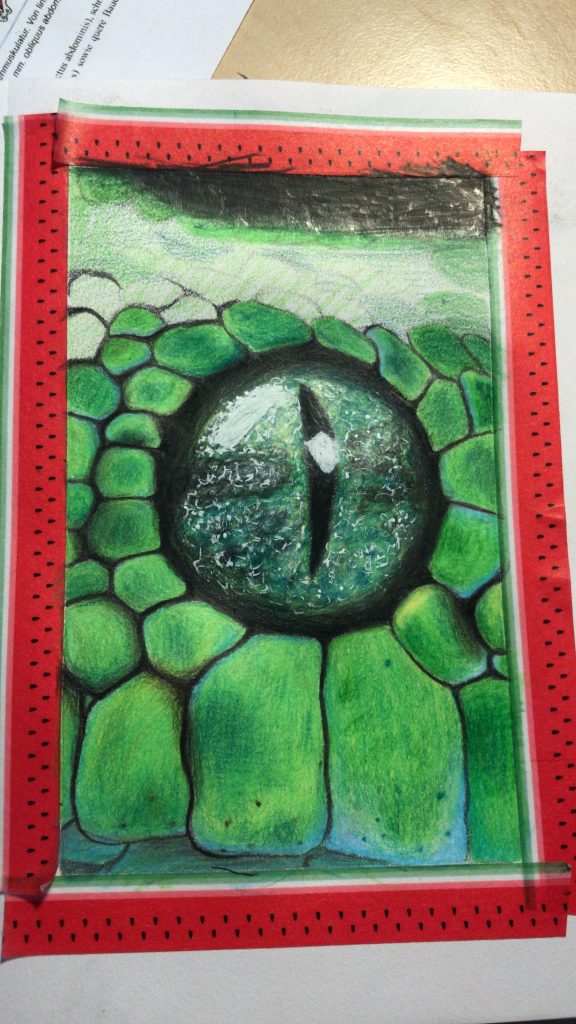 Vom Auge aus bin ich dann immer mehr in Gesicht gekommen. Das Augenlid habe ich dunkel an den Rändern und hell in der Mite gezeichnet, so werden Lichtverhältnisse dargestellt.