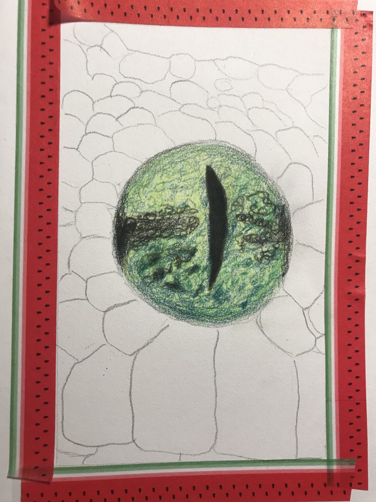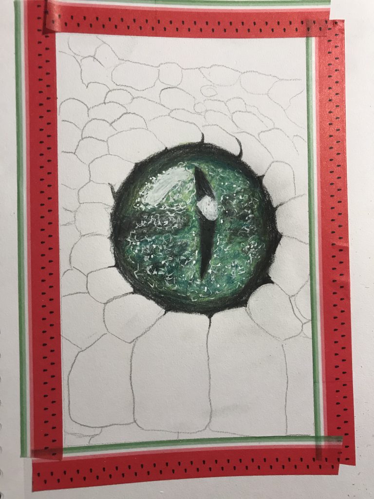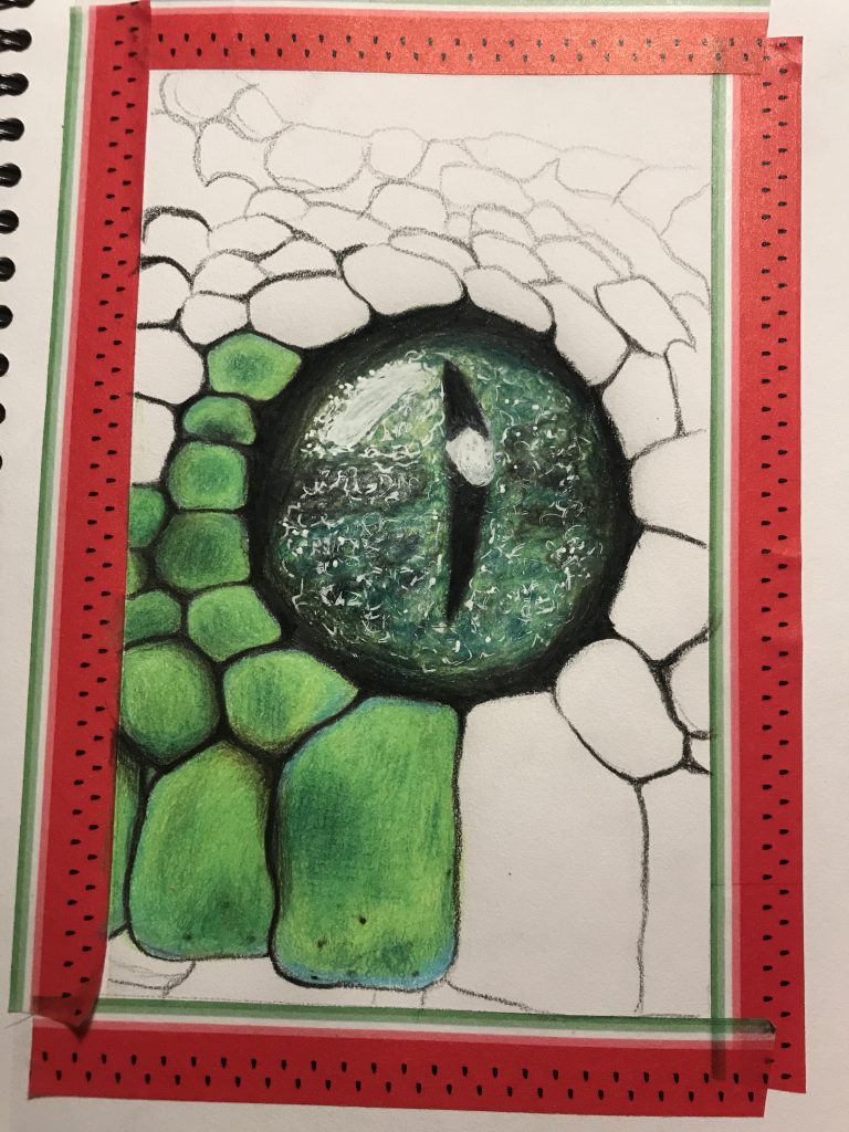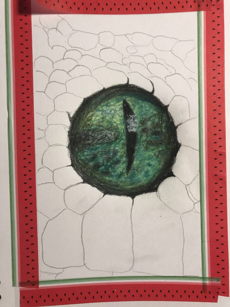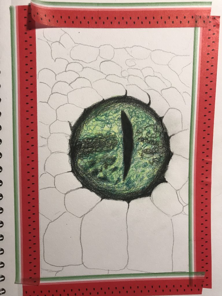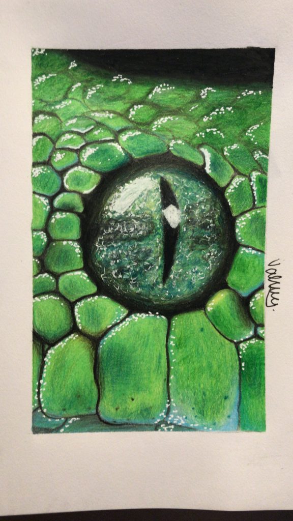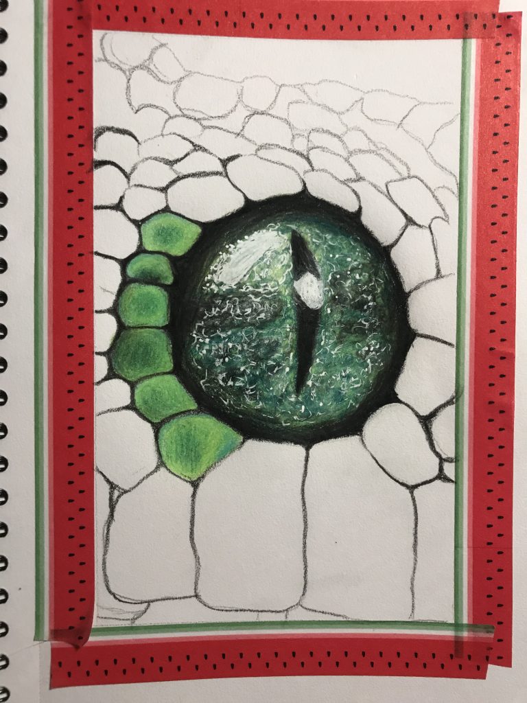 Vom Auge aus bin ich dann immer mehr in Gesicht gekommen. Das Augenlid habe ich dunkel an den Rändern und hell in der Mite gezeichnet, so werden Lichtverhältnisse dargestellt.