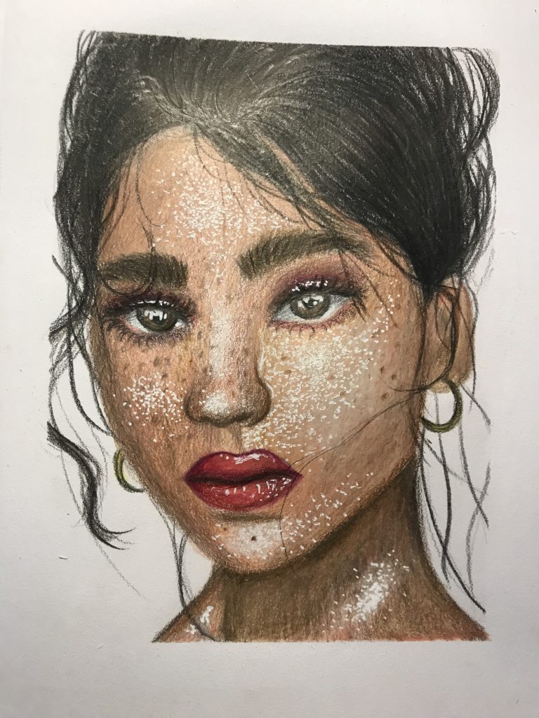 Augen werden jetzt ausgemalt und Details hinzugefügt. Für die Sommersprossen habe ich keine symmetrischen Punkte gezeichnet, sondern eher verschiedene Formen in unterschiedlichen Größen.